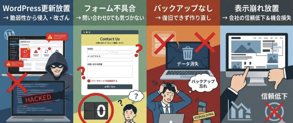 こうした疑問はとても多いです。特にWordPressのサイトは、公開後も“放置しない”ことが重要。なぜなら、更新やセキュリティ対策を怠ると、表示崩れ・フォーム不具合・改ざんなどが起きやすくなるからです。